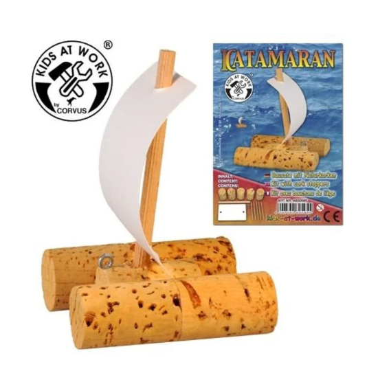 Maritimes Bastelset: Aus Naturkorken, Ringschraube, Mast (Buchenholz) und Segel (Kunststoff, bemalbar) wird ein windschnittiger Katamaran. Höhe 10,5 cm. Achtung! Kinder am Wasser nie unbeaufsichtigt lassen, es besteht Gefahr durch Ertrinken!
