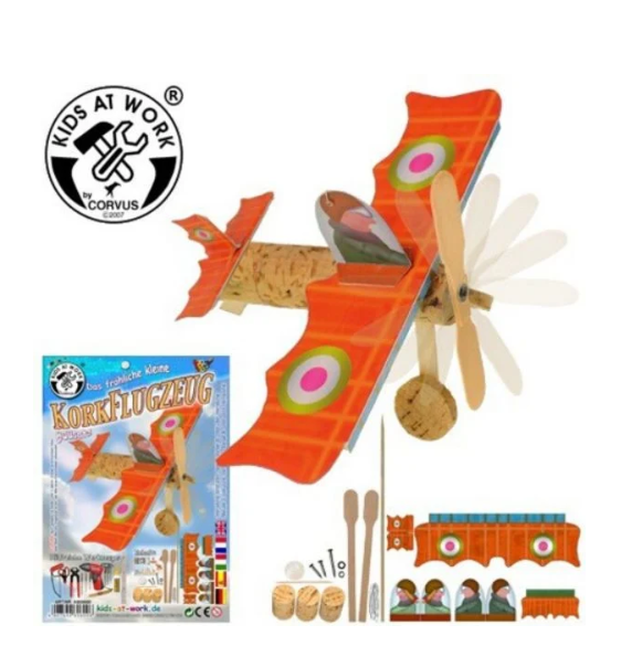 Kleiner Bastelbausatz. Flugzeug mit Rumpf aus Flaschenkorken, Propeller aus Einweg-Essspatel, Tragflächen mit Schaschlikspieß und bedrucktem Papier. Lernziel: auch mit einfachsten Materialien lassen sich feine kleine Sachen basteln. Es muss nicht alles komplett vorgefertigt sein, nur wer selber baut, schaut und fliegt in den Himmel der Bastlerwonnen...