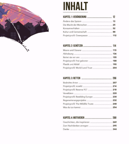 INHALTKapitel 1: Veränderung - Ändere das System- Die Macht der Menschen- Konsumverhalten- Kultur und Gemeinschaft- Projektprofil: GreenpeaceKapitel 2: Schützen- Meere und Ozeane- Abholzung- Rettet sie vor uns- Projektprofil: Frei geboren- Plastik und Abfall- Projektprofil: World Land TrustKapitel 3: Retten - Bedrohte Arten - Projektprofil: re:wild - Projektprofil: Reserva YLT - Verwildern - Projektprofil: Rewilding Europe - Regenerierungsprojekte - Projektprofil: The Wildlife Trusts - Was du tun kannst Kapitel 4: Motivieren- Geschichten, die inspirieren - Zum Nachdenken anregen - Danke