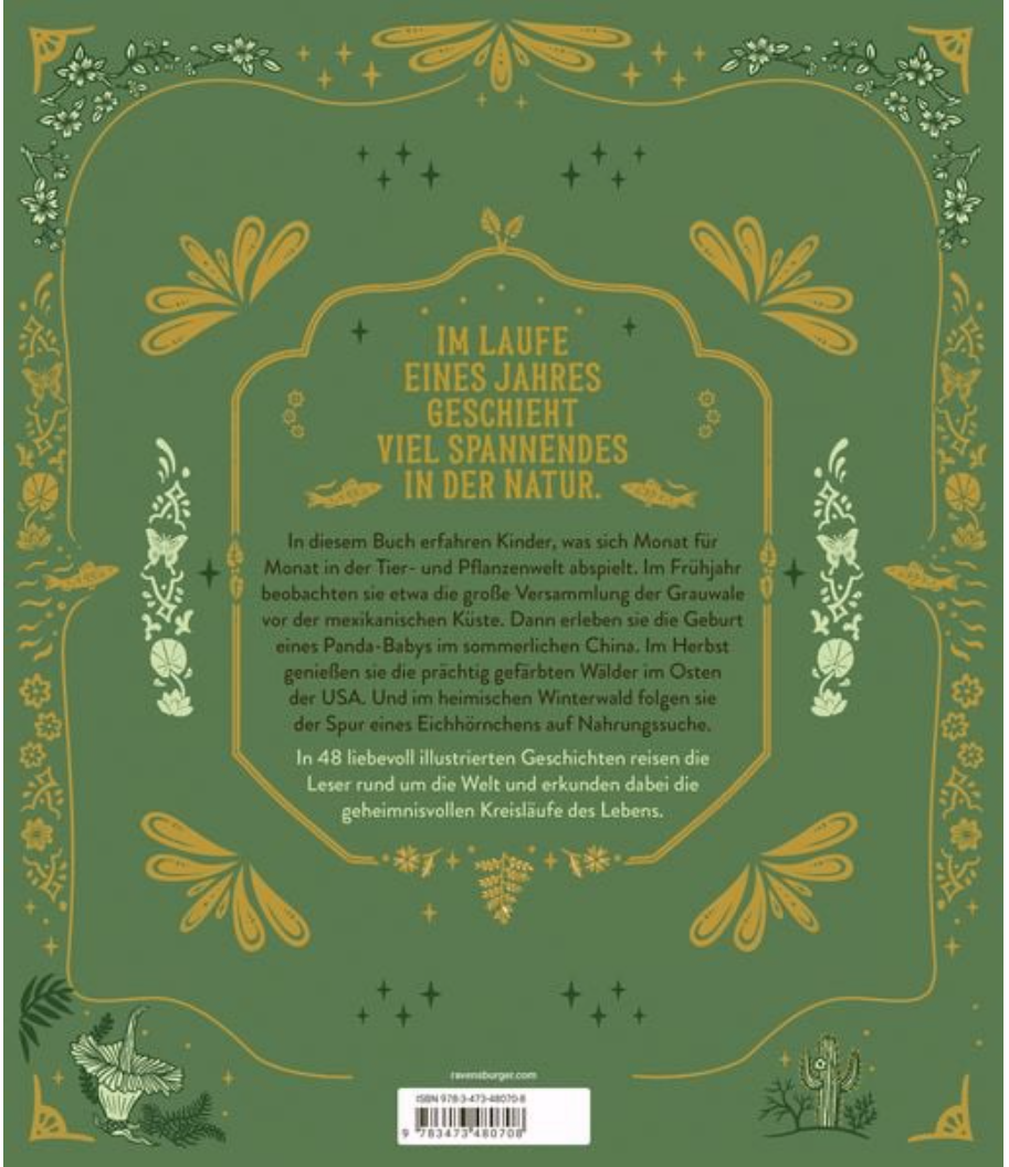 Tag für Tag vollbringt die Natur im Wechsel der Jahreszeiten wahre Wunder. Irgendwo erblüht die Erde im Frühlingsgewand, funkeln Leuchtkäfer im nächtlichen Sommerwald, braut sich ein Herbststurm zusammen oder sammelt ein Eichhörnchen Nahrung für den Winter. Dieses nach Monaten geordnete Buch bietet 48 spannende Sachgeschichten über Tiere und Pflanzen rund um den Globus. Die liebevollen, farbenfrohen Illustrationen bringen Tiere, Pflanzen und Lebensräume ins Kinderzimmer.
