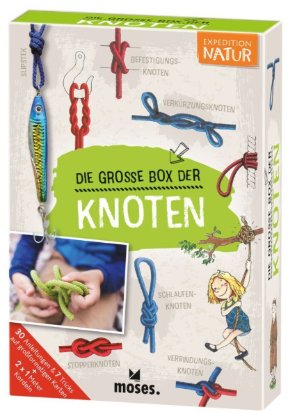 Draußen in der Natur sind unterschiedliche Knoten hilfreich: zum Angeln, um eine Strickleiter zu bauen oder ein Zelt zu befestigen. Diese Box erklärt 30 Knotenarten kinderleicht! Die beiliegenden Kordeln helfen beim Üben, die großformatigen Karten zeigen die Anleitungen übersichtlich und leicht verständlich. 7 Tricks zeigen darüber hinaus, wie einfach man mit Hand und Faden sein Publikum verblüffen kann.
