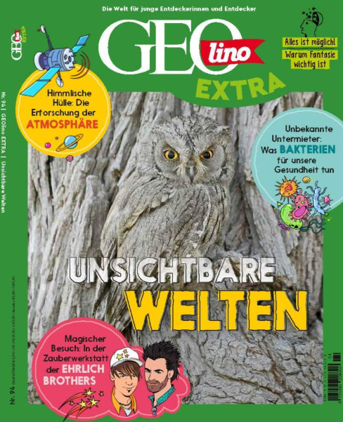 UNSICHTBARE WELTEN: Pro Sekunde nehmen unsere Augen mehr als 100 Millionen Informationen auf und unterscheiden 600 000 Farbtöne. Trotzdem bleibt vieles für uns unsichtbar - etwa weil es zu klein, zu weit weg oder verborgen ist. In GEOLINO EXTRA wollen wir mit euch all dieses Unsichtbare entdecken: Kommt mit ins Reich der Fantasie. Erfahrt, wie blinde Menschen ihren Alltag bewältigen oder wie Forschende mit Tarnkappen Gegenstände verschwinden lassen wollen. Und baut euch ein eigenes Mikroskop - unsere Werkstatt zeigt euch, wie. Sicher ist: Hinterher werdet ihr die Welt mit anderen Augen sehen!- Winzigkeiten wie die Facettenaugen einer Fliege können wir nur erkennen, wenn wir sie mit dem Mikroskop vergrößern. Wir zeigen, wie sie funktionieren- Supersinn: Der Hammerhai besitzt ein Spezialorgan, mit dem er elektrische Impulse wahrnimmt - und damit den Herzschlag seiner Beute- Der Knaller! Die Ehrlich Brothers lassen uns hinter die Kulissen ihrer magischen Show blicken- Die Atmosphäre umhüllt und schützt die Erde. Wie? Das wollen Forschende mithilfe von Laserstrahlen herausfinden