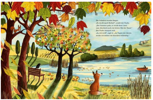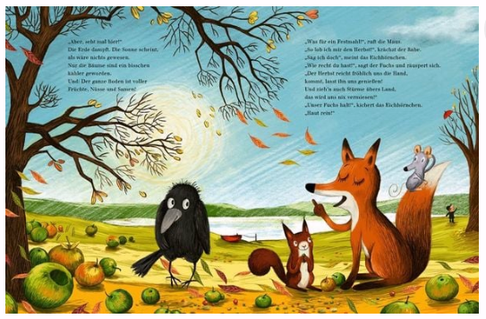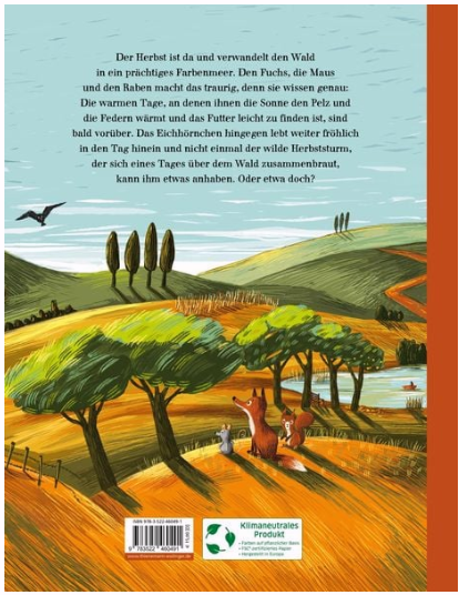 Der Herbst ist da und verwandelt den Wald in ein prächtiges Farbenmeer. Der Fuchs, die Maus und der Rabe werden schwermütig, denn sie wissen genau: Die warmen Tage, an denen ihnen die Sonne den Pelz wärmt und das Futter leicht zu finden ist, sind gezählt. Das Eichhörnchen hingegen macht sich überhaupt keine Sorgen. Es lebt fröhlich in den Tag hinein und nicht einmal der wilde Herbststurm, der sich eines Tages über dem Wald zusammenbraut, kann ihm etwas anhaben. Oder etwa doch?