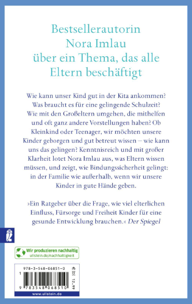 "Wie viel Eltern braucht ein Kind? Wie können wir Fürsorgepflicht und Freiheitsdrang vereinen? Und vor allem: Wie kann es uns gelingen, ein gutes, stabiles Bindungsnetz für unsere Kinder zu knüpfen?" Nora Imlau