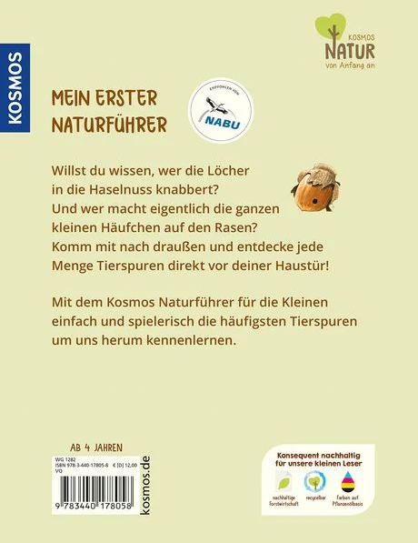 Buntspecht, Dörrobstmotte, Biber: wer ist hier wohl vorbeigekommen? Wer wohnt hier? Wer hat hier gefressen? Pfotenabdrücke, kleine Futterreste und Höhlen verraten, um welche Tiere es sich handelt. Dieser Naturführer vermittelt erstes Wissen über 16 Tierspuren. Dank der großen detaillierten Zeichnungen lassen sich die Spuren leicht wiedererkennen. Kindgerechte Texte und kurze Steckbriefe erklären das Verhalten und die Besonderheiten der einzelnen Tiere. Vorgestellt werden nur Arten, denen Kinder in ihrem Alltag begegnen. Eine tolle Beschäftigung mit der eigenen Umgebung. Für Natur-Fans ab vier Jahren. Empfohlen vom NABU.