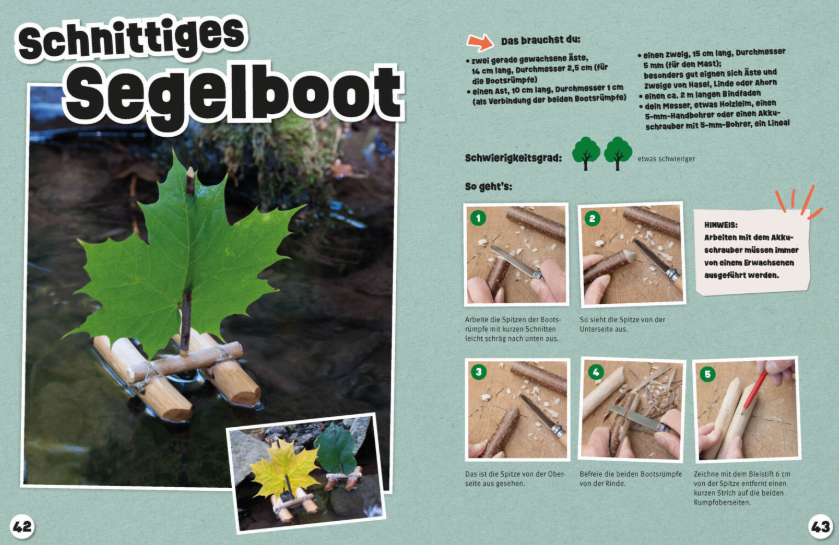 Auf geht's ins Abenteuer Natur! Überall, wo es frische Zweige und Äste gibt, lassen sich mit dem Schnitzmesser tolles Spielzeug, nützliche Dinge und schöne Dekorationen schnitzen. Ruck-zuck entstehen aus frisch gesammeltem Grünholz ein Segelboot, lustige Mäuse, kleine Pilze, ein Floß mit Blättersegel, ein schnelles Rennauto und vieles mehr!