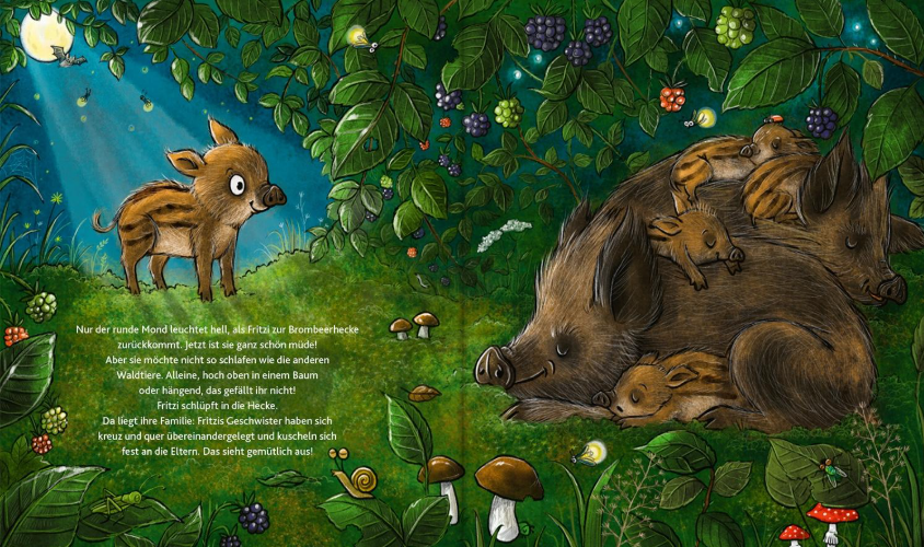 Obwohl Fritzi längst schlafen sollte, ist das kleine Wildschweinmädchen gar nicht müde. Und überhaupt ist es ja noch nicht mal richtig dunkel! Also krabbelt Fritzi aus der Brombeerhecke und tapst neugierig in den Wald. Auf ihrem Spaziergang bemerkt Fritzi, dass jedes Tier ganz unterschiedlich schläft: Das Reh legt sich alleine in eine Kuhle auf den Waldboden, der Specht gähnt hoch oben im Baum und die Fledermäuse schlummern kopfüber hängend. Das sieht aber nicht sehr gemütlich aus ... Als der Mond schon hell leuchtet, kehrt Fritzi zur Brombeerhecke zurück. Ihre Geschwister und Eltern liegen eng zusammengekuschelt auf dem weichen Moos. Das ist bestimmt bequem! Also schmiegt sich das kleine Wildschweinmädchen fest an seine Familie und ganz langsam fallen ihm die Augen zu. Gute Nacht, Fritzi!